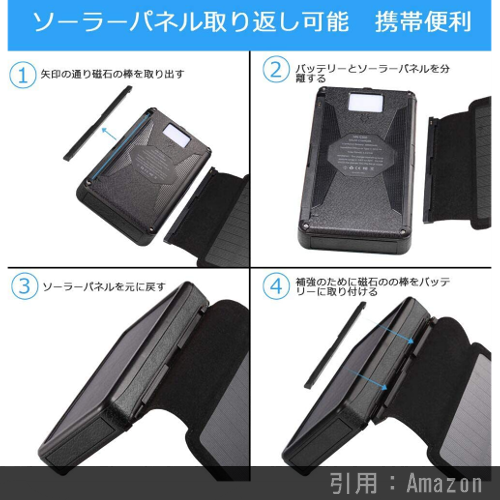 ソーラー充電器は4枚の『高転換率単結晶シリコン製ソーラーパネル』を搭載しており、単パネルのパワーが330mA、転換率が24.5%。他のソーラー充電器よりも4〜6倍高速で、日当たりの良い場所に置くことで自動充電されます。4枚あるソーラーパネルは折り畳み式になっているため携行性も◎。