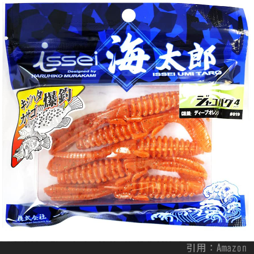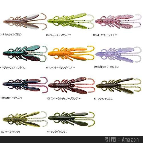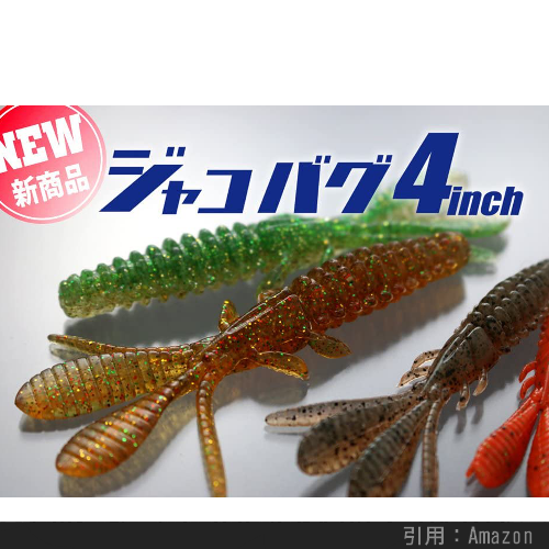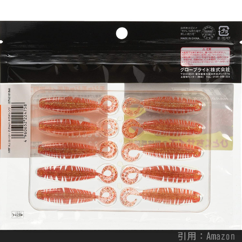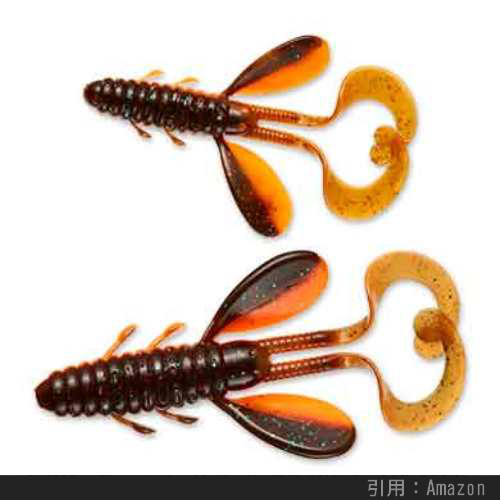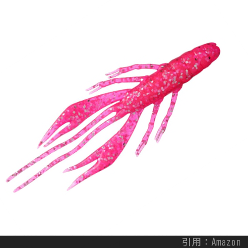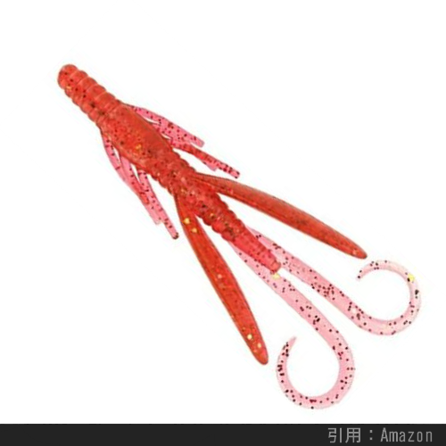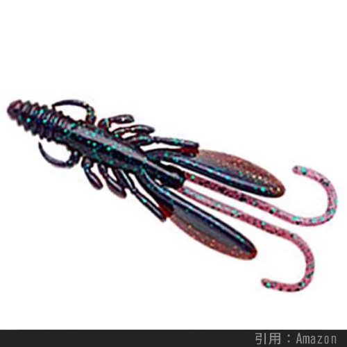 上のように海老やカニなどの甲殻類を真似た外見をしており、カサゴ・アイナメの反応が非常に良いです。特に先述したボトムバンピングの釣り方にマッチしているらしく、根魚釣り上級者の一軍ワームに必ずエントリーするカタチです。