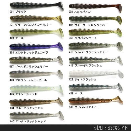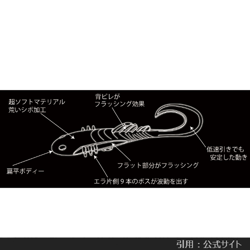 大きな尻尾と平面ボディによって高い波動とフラッシングを獲得したニュータイプのシャッドテールワームです。平安定してナチュラルかつハイピッチなローリングアクションを繰り出し、かつ他のシャッドテール系ルアーとは異質の波動を生むことでバイトを誘発。パワーシャッドと使い分けをしている方が多い印象。