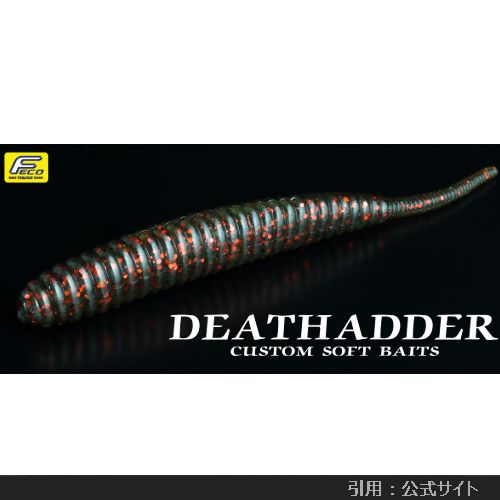 バス用のルアーですが根魚釣りでも大活躍してるっぽいデスアダーです。水流を身にまとうボディーフォルムと、急激に細められたテールが生むリアルなタイトバイブレーションが特徴。
