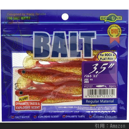オフシーズン以外には定価で買うことが困難なほどの大人気ワームです。もとはシーバス狙いに開発されたっぽいですが、根魚にフラットフィッシュに大活躍。ナチュラルな微弱ロールとリブから発する水流がカタクチイワシそのものの波動を生み出しているらしく、タフコンディション(アピール力の強いワームでは食ってこないような状況)でも釣れるワームです。