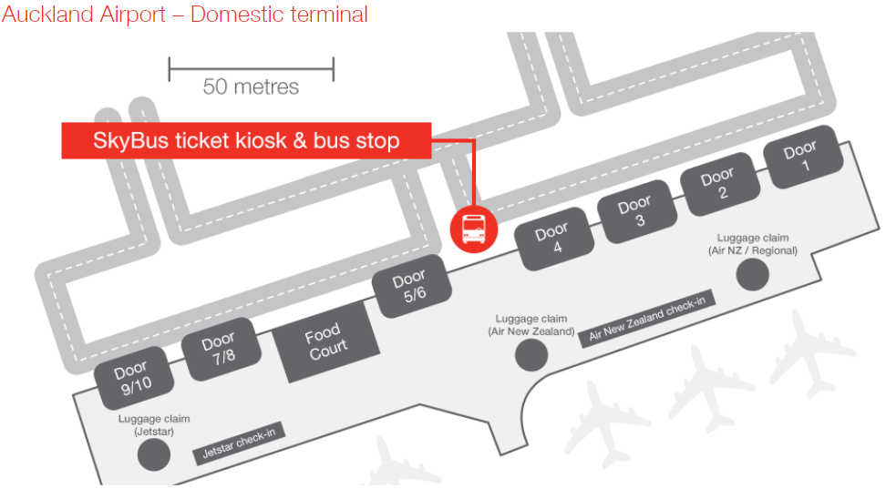 オークランドのスカイバスは、オークランド国際空港国際線ターミナルとブリトマート駅近くとの間を、約45分ほどで結んでいます。