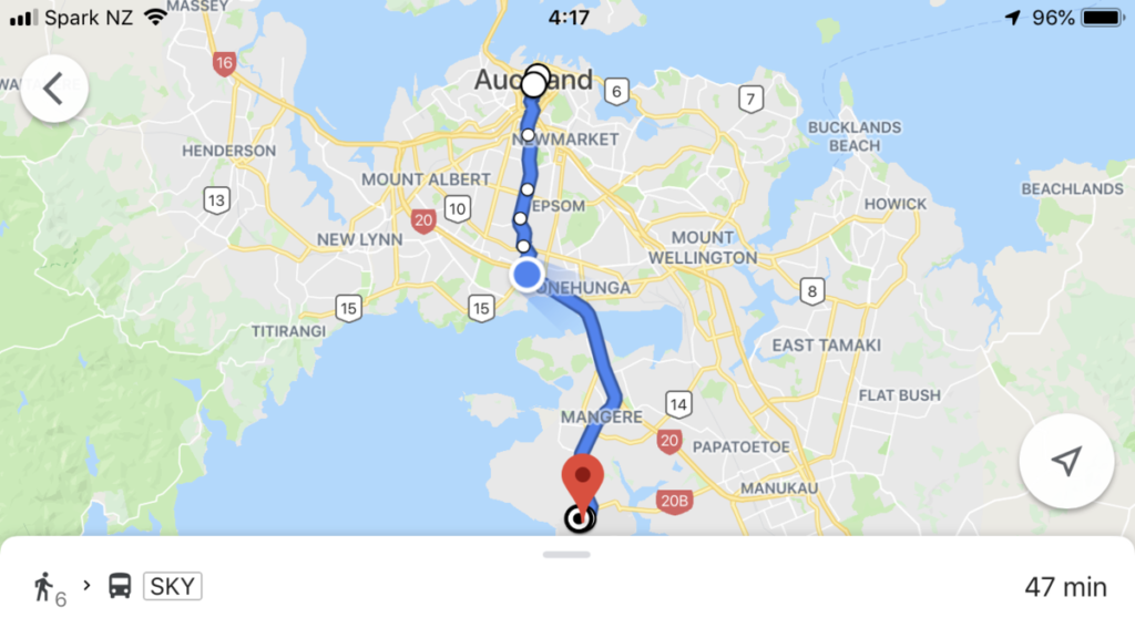 貧乏根性を持つ私としては徒歩での移動を検討しましたが、坂道の多いオークランドの土地柄と区間距離が20キロほどあるため断念せざるを得ませんでした。