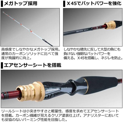 リーズナブルな価格ながら、軽量化を徹底追及し、感度・操作性の最適バランスを目指した黒船シリーズのライト五目モデルです。小口径ガイドの多点セッティング、マイクロガイドシステム採用により、ガイド重量約50%軽量化。また軽いだけでなく、カーボンXテープも採用し、粘りとトルクのある強いブランクスに仕上がっています。