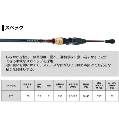 ロング仕掛け対応と扱いやすさを両立した瀬戸内メバルロッドです。連掛けでも安心なバットパワーに、しなやかな穂先の絶妙なバランス設計。喰い込み重視の柔軟アクションとなっており、5:5乗調子のロングロッドながらも軽量・高感度というグレードを超えたパフォーマンスを持ちます。