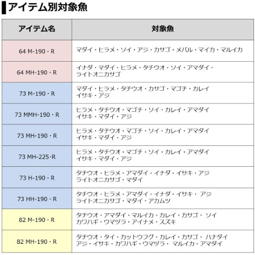 沖釣りをライトにゲーム感覚で楽しむための汎用性の高いロッドです。沖メバル専門ではありませんが、スペックの通り問題なく使えます。沖メバルの他、ヒラメ・タチウオ・マゴチ・ソイ・カレイ・アマダイ・イサキなど幅広い対象魚に対応。いろいろなモデルがありますが、沖メバル釣りには64(6:4調子)もしくは73(7:3調子)、Mクラスがおすすめです。