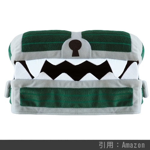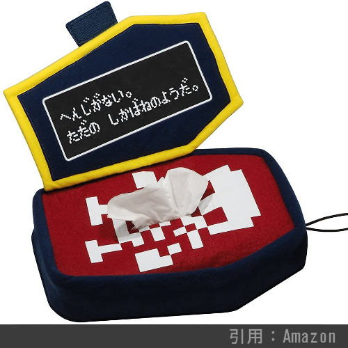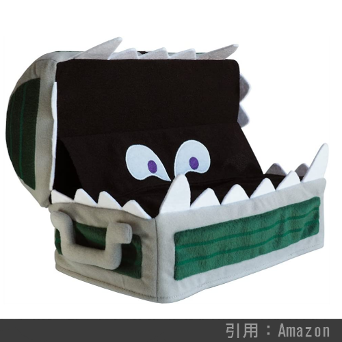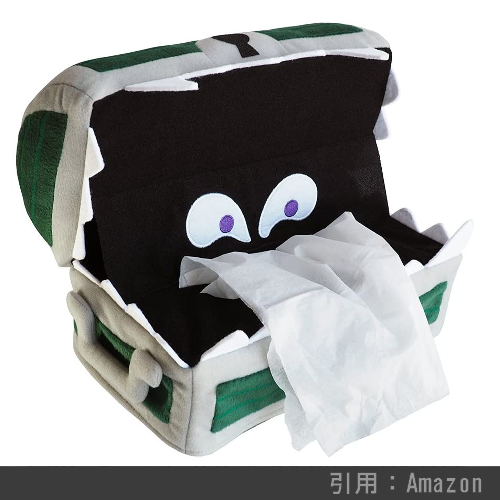 ドラクエシリーズおなじみの強敵、宝の中身は何か期待して中を空けたプレイヤーを襲撃するモンスター「ミミック」の形をしたボックスティッシュ用カバーです。こちらを死に至らしめるザラキ系の呪文をも使い果たすミミック。そんなミミックのティッシュカバーを使用することで、私達の何気ない日常生活にも常に危険が隣り合っている『一寸先は闇である』というメッセージを持たせることが出来るでしょう(個人的感想です)。
