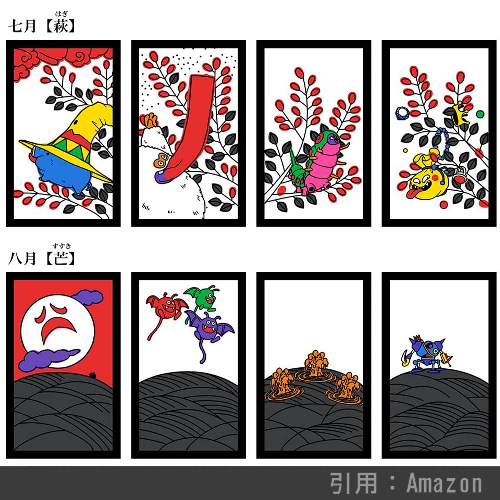 ドラゴンクエストシリーズに登場する沢山のモンスターをあしらった、全札オリジナル柄の花札です。 花札として使用するのはもちろん、イラストをながめているだけでも楽しい仕上がりでおすすめ。カス札まで「まものがあらわれた!」状態で豪華、つい点札と間違えてしまうというレビューがあるほど綺麗に仕上がっています。