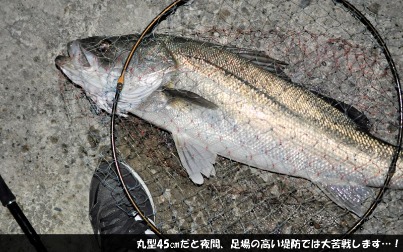 筆者はタモ枠が45㎝のモノを使っています。通いなれた堤防(6m)でのタモ入れ作業、日中なら何とかなりますが、夜間のランカーシーバスなどのビッグフィッシュは困難を極めたりしてます。