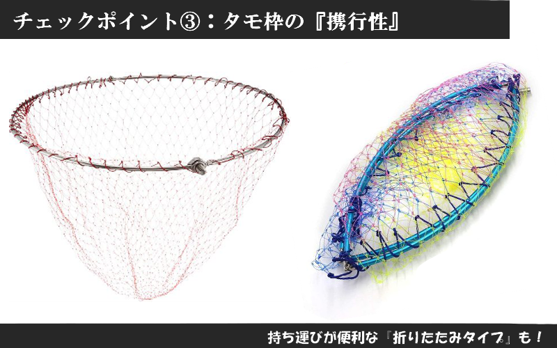 のタモ枠がおすすめです。タモ枠が大きいほど魚を取り込みやすいのですが、その分 携行性が悪くなったりします。自分の釣りに合ったタモ枠を選びましょう。