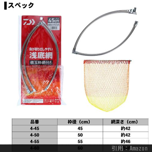 信頼できる一流釣具メーカーDAIWAのタモ枠+ナイロン網セットです。網深さは46㎝と少し短く感じるかもしれませんが、取り込んだ魚が網に絡まりにくく取り出しやすい浅底網として有用です。網カラーも見やすいオレンジ/イエローの2段カラーで使いやすいです。