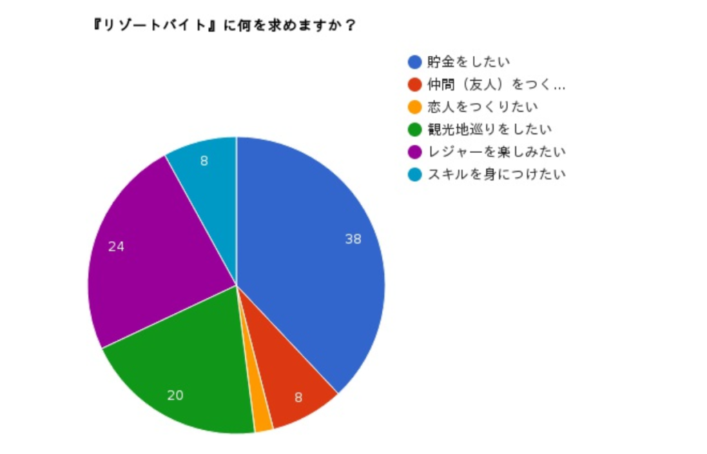 私がリゾバで一番 メリットだと感じるのは後述しますが、『彼氏・彼女ができやすい』だと思ってるんですけど、リゾバをされる方の第一の目標は「貯金」だそうです。まぁそうですよね。お金よりも恋人がほしいなんて言うのは私みたいな最近になって人恋しくなってきたような奇特の人くらいでしょうね。