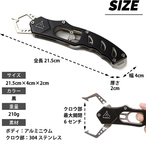 アルミ合金にアルマイト処理を施した、超軽量で強度、耐腐食性に優れたフィッシュグリップ フィッシュキャッチャーです。全長約250㎜でリーチも長く、クロウ部も26㎜と大きく開くので、安全に魚をキャッチ。20kgクラスの魚でもキャッチしても安定感は抜群とのことで、ライトゲームで釣れる魚はもちろんの事、大型魚用としても使えるそうです。