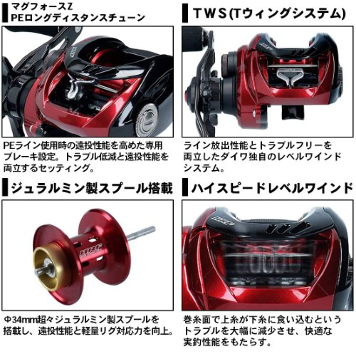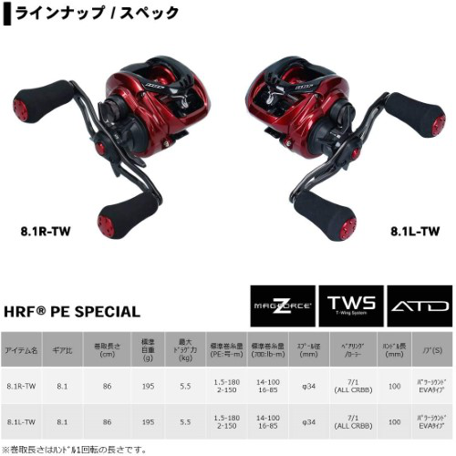 ダイワのロックフィッシュ専用機とも名高いHRF® PE SPECIALです。ベイトキャスティングリールに求められる遠投性能とパワフルな巻上げのきわだつ性能に仕上がっており、マグフォースZ PEロングディスタンスチューンとTWSとの相乗効果で卓越した遠投性能を追求されています。掛けた瞬間のひと巻き目が勝負であるロックフィッシュゲームにおいて、根から引き離し主導権を握るギア比8.1もおすすめポイント。