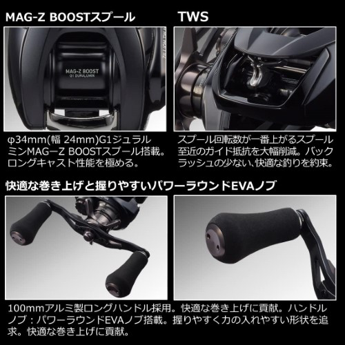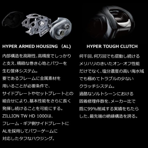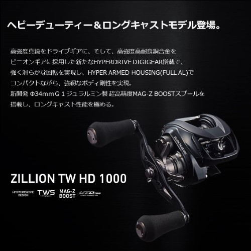 よく飛び、コントロール性が上がり、フォールも速く、バックラッシュが少ないというTWSが搭載されており、ロングキャスト性能を極めた2022年発売のジリオンTW HDです。高強度真鍮をドライブギア、高耐食銅合金をピニオンギアに採用した新たなHYPERDRIVE DIGIGEAR搭載で、強く滑らかな回転を実現し、HYPER ARMED HOUSING(FULL AL)でコンパクトながら、強靭なボディ剛性を実現。