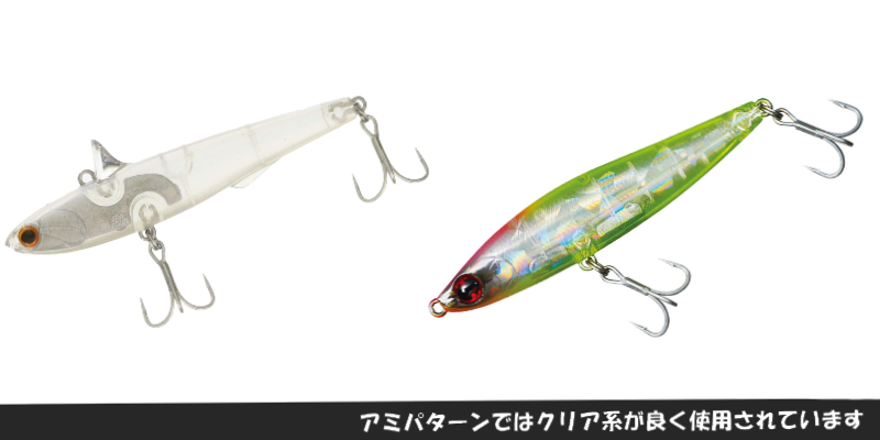 おすすめはありませんが、ナイトゲームのアミパターンでは上の画像のような『クリアカラー』が良く使用されているイメージがあります。シーバスがルアーを見上げた時に、クリアカラーだと輪郭がボヤけるため、アミが密集しているような視覚的効果が期待できるそうです。