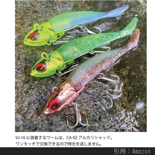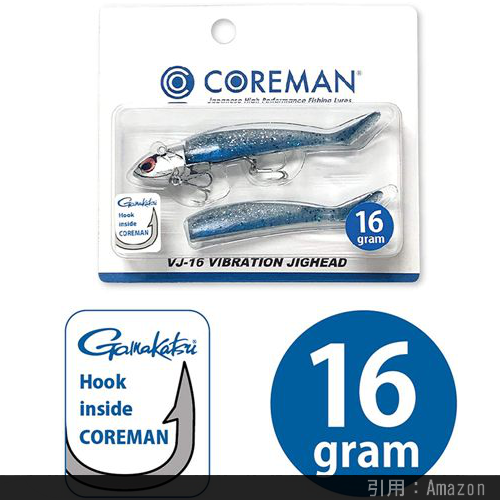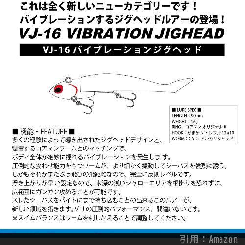 反則級(もはやエサ並み)との呼び声高い傑作ワームです。独特のジグヘッドデザイン、装着するコアマンワームとのマッチングが素晴らしく、ボディ全体が絶妙に揺れるバイブレーションを発生させるVJシリーズ。警戒心の高いシーバスすらも魅力する圧倒的な食わせ能力が特徴。若干 価格が高いですが、細かく振動して良くシーバスが釣れます。水深が浅いポイントでは16gがおすすめですが、22g以上のサイズの飛距離も捨てがたいです。