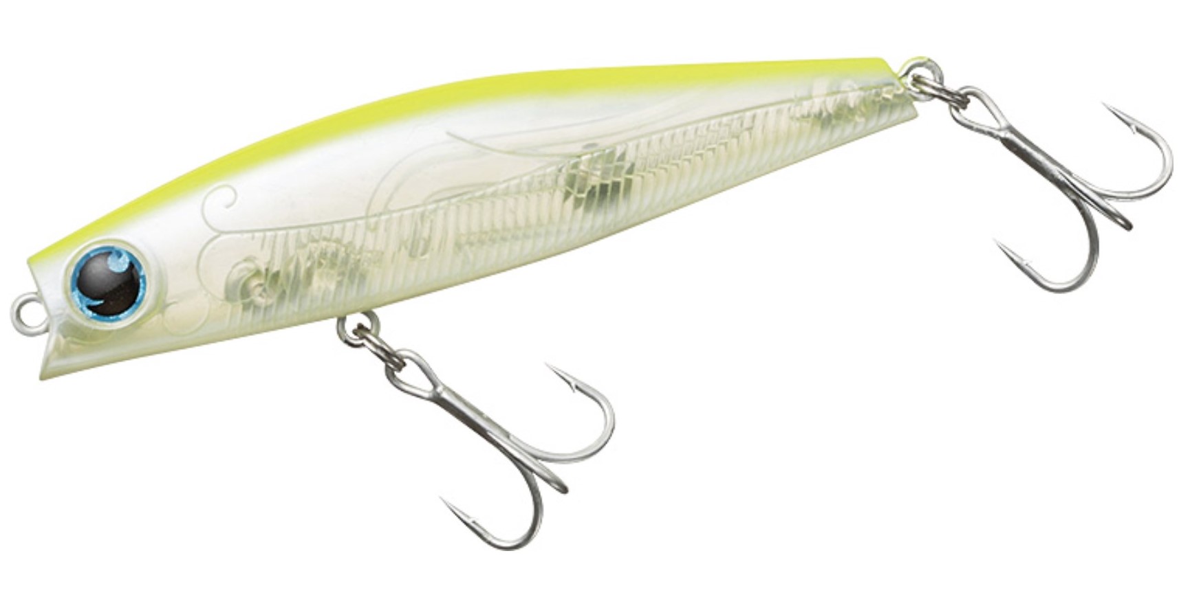 浅い水深でもゆっくりとしたフォール、アクションはゆったりとしたS字スラロームでじっくりと誘うことが出来るパンチラインです。特にシャロー域における込み潮時が得意なシンキングペンシルで、下げ潮に比べて流れが緩くなる傾向がある為、ルアーの挙動や潮流の変化を手元へと明確に伝えてくれるパンチラインが特に有効です。水深3m以浅のシャローを中心に、表層~低層域の魚へのアプローチ最適なおすすめシンキングペンシルです。