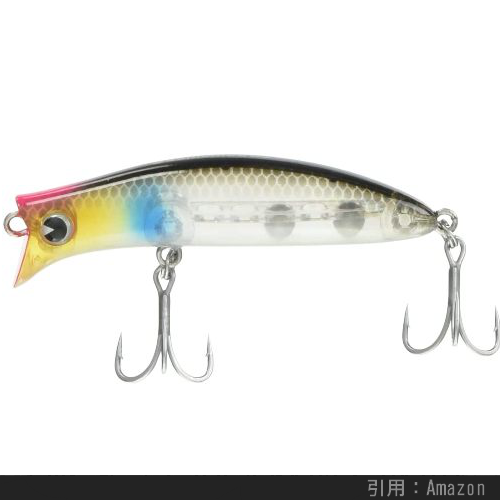 トップウォーター攻略に欠かせないルアーで、水面直下を狙うときに大活躍します。一番表層を狙うときに重宝されるルアーで、水面を引き波立てながら泳ぐことによってシーバスにアピール出来ます。稚鮎パターンでは一番最初に投げておきたいポッパーです。