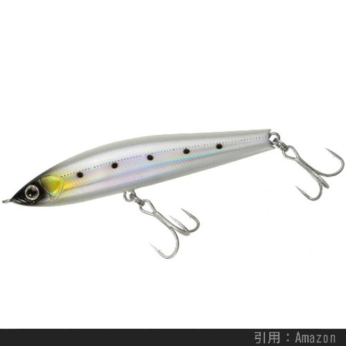 ネットショッピングでは定価で買えないほどの過剰な人気を博している王道ルアーです。ショートポッピングからロングダイブまで多彩なポッピングアクションが可能。リトリーブすれば、デッドスローから中速まで水面でモコモコと引き波を出しながらシーバスを誘います。ポッパーなのに引けば水面で引き波を出して泳ぎます。ポッピングで誘うもよし、引き波で誘うもよし。定価で買えたらなぁ…