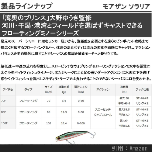 ガルバよりも飛距離は落ちますが、足元のスーパーシャローを攻めやすくなったソラリアです(それでもサイズ70で平均飛距離は50m近くありますが…)。体高のあるボディは流れの変化を敏感にキャッチし、アクションバランスを半自動的に崩すことでシーバスの意識を捕食モードへと駆り立てます。超低速~中速の流れを得意とし、スローピッチなウォブリング&ローリングアクションで水中を優雅に泳ぐ稚鮎などの小型魚を模倣しています。