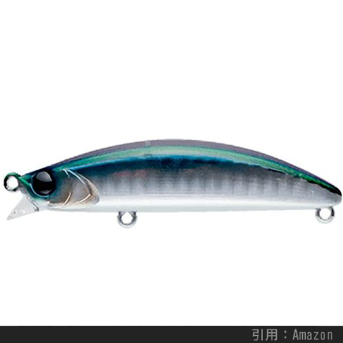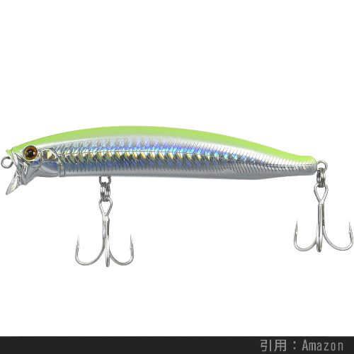 空気抵抗を極力控えたカタチ(細身)になっており、ミノーと同じく魚を模したデザインであっても飛距離が段違い。アピール力はミノーには劣りますがナチュラルに泳ぎ、ミノーの激しすぎるアクションを見切ったシーバスに有効です。