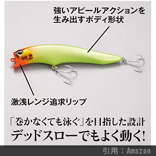 シャローエリアでの使用は難しくなりますが、足場の高い堤防や磯場で、瀬際に潜むヒラスズキを狙ったりする際に『足元までしっかりと泳がせる』ことが出来るという利点もあります。