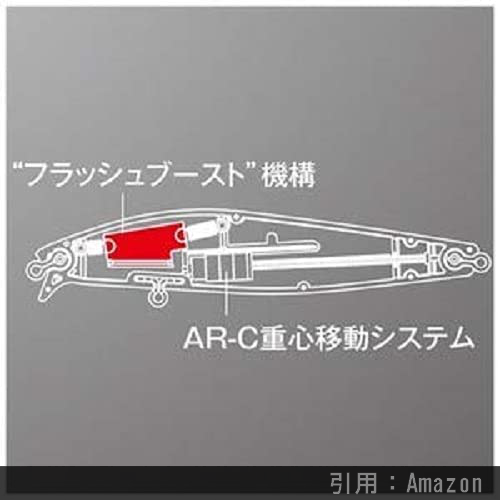 重心移動システムの常識を覆すバネ式重心制御を採用しているAR-Cシステム。 キャスト時に、遠心力と加速Gでウエイトを後方へ移動させます。 そして、バネ式重心制御を搭載することで、ウエイトが戻り、着水時には固定重心ミノーと同等の安定姿勢で抜群の立ち上がりを実現しています。最近ではJET BOOST(ジェットブースト)と名称が変わってたりします。