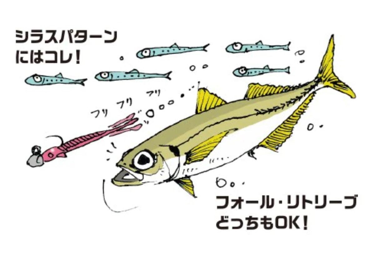 プラグのようにアクションを加えることなく落とすだけ(フォール)、もしくは引いてくるだけで魚にアピールしてくれること間違いなしのモモアジです。