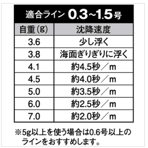 筆者は海面ぎりぎりに浮く3.8gモデルを選びました。飛距離・攻めるレンジによって適切なモデルを選びましょう。とにかく飛距離を出したいのであれば、ロッドの適合ルアーウェイトの上限に近いモデルがおすすめです。