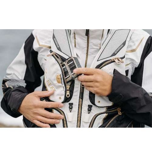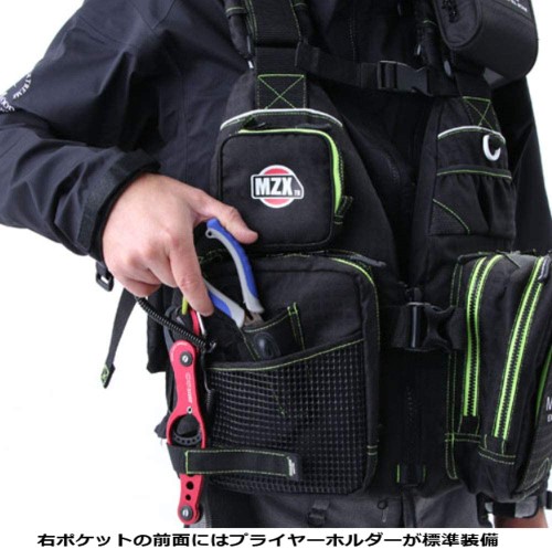 ビギナーからエキスパートまで幅広く対応するフローティングベストしてくれるです。左右のフロントポケットにはタックルケース等が効率的に収納できます。右胸元には取外し可能なポーチ付。ドリンクホルダー、プライヤーホルダーも標準装備。背面にはレインウェアなどを収納できる大型ポケットを配置した事で様々なシチュエーションに対応。又、移動時にランディングネットを背負う時に便利な「Dカン」装備。リフレクター反射板や股ヒモ(股ベルト)を搭載し落水時にベストが脱げる事を抑制し安全面にも配慮しています。