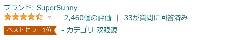 2400件以上の評価数を誇り、☆は4.5点。ベストセラー1位も納得な双眼鏡である。