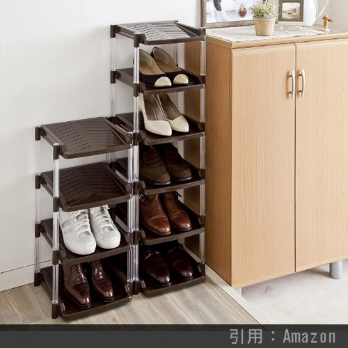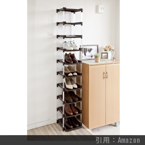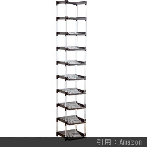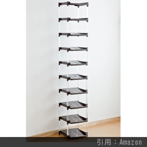 30㎝四方があれば設置完了なシューズラックです。他のシューズラックでよくあった『ハイカットスニーカーが入らない』というトラブルもなく、シンプルながら機能性が高いです。2分割にもできることを考えるとコスパは最高レベル。