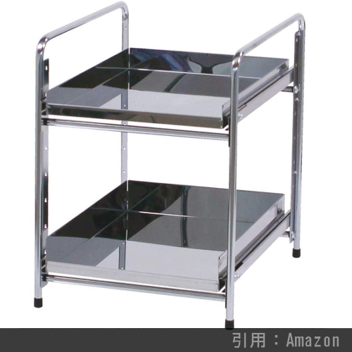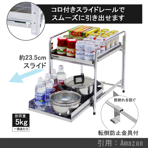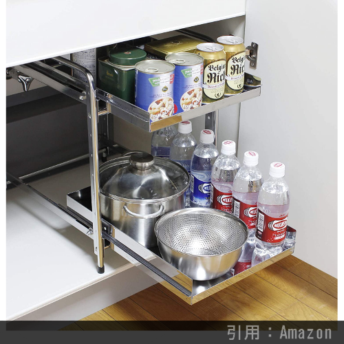 お鍋・ボウル等のかさばる器物や、細かなキッチンツール、食品・ラップ・ホイルなどのストック品をシンク下空間利用して効率よく収納できます。日本製ということもあって細部までしっかりと作られています。価格は高くとも、レビュー評価は非常に高いスライド式のラックです。