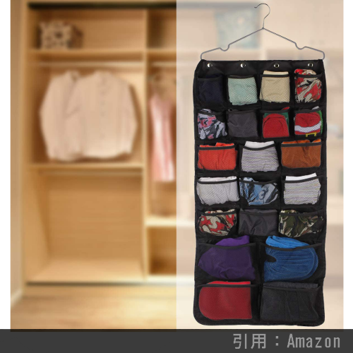 下着や靴下など、放っておくと『あれ、どこだったっけ??』となりがちな小物の収納に便利です。ウォールポケットはメッシュで作られており、内容物が簡単で見つけられます。通気性が良いコトから、とにかくいろいろな小物に使えます。両面使えるのも◎。