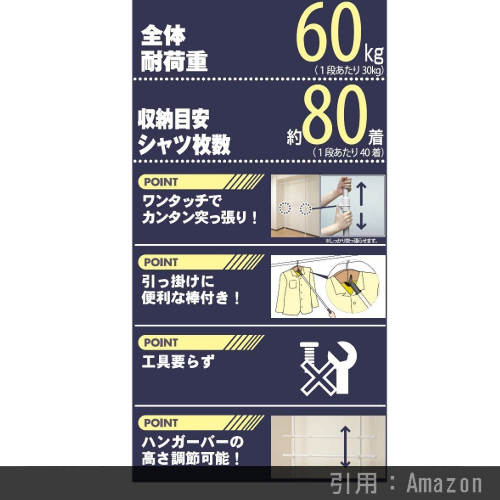 名前の通り、『突っ張り棒』を使用しているハンガーラックで、組み立ても簡単(工具不必要!)。必要なくなったときに場所をとらないという点も◎。部屋干しに使えるというのも利便性があります。