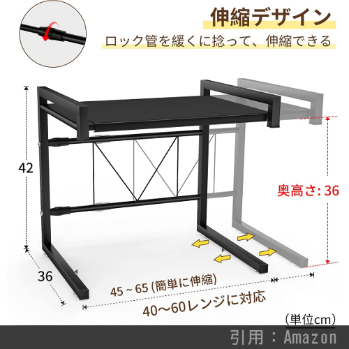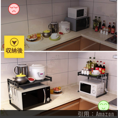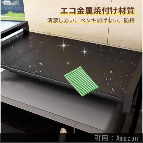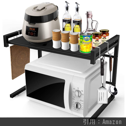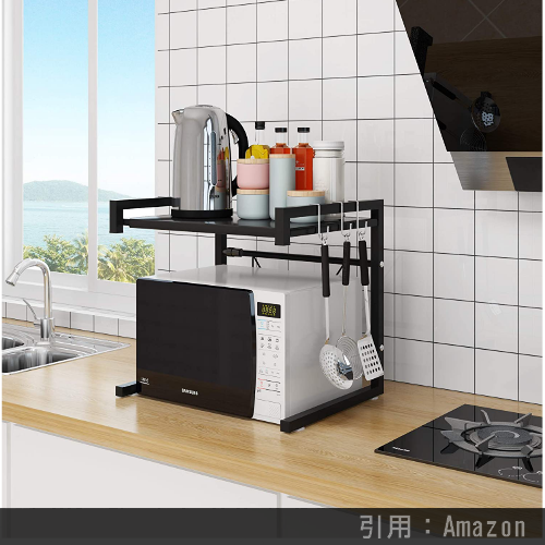 常温で保存できる調味料や電気ケトルの置き場として電子レンジ上が使われたりしますが、ちょっと見栄えが悪い。そんなときにおすすめのラックです。スチール製で熱や汚れに強く油や汚れをこぼしても「サー」とひと拭き、お手入れ簡単。底には吸盤も付いているので安定感も抜群です。