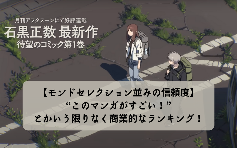 石黒が描くだけあって世界観とか軽快な台詞回し等、純粋に漫画として完成されていて面白かった。が、少なくとも1巻の段階ではただただ物語の基礎を描いているようなモンで、確かに興味は引かれた僕だったが、それまでに受賞していた「デトロイトメタルシティ」のような爆発的面白さはなかった、と思う。まぁギャグマンガと比べるのは筋違いだけど、それほど賞の受賞には納得いかなかった。批判的読者の言う通りに面白くなかったらアイキャッチ画像は