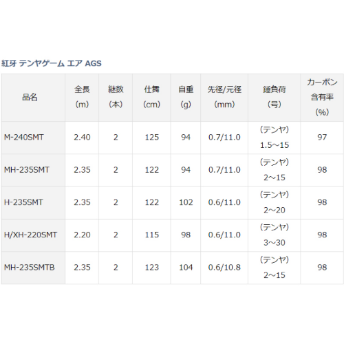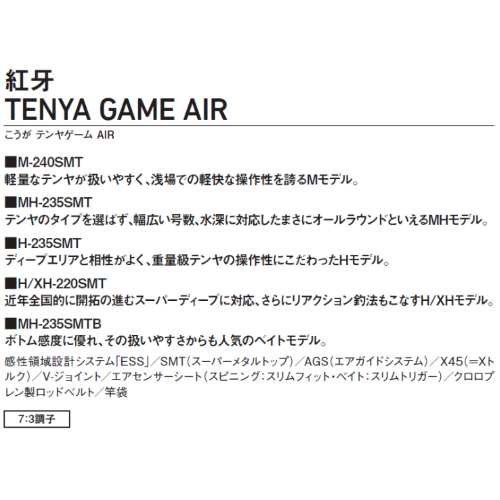 感度と操作性が光る、テンヤマダイロッドのハイスタンダードモデルです。AIRコンセプトのもと、軽量化と操作性、感度を追求したシリーズとなっており、『AGS』と『SMT』の組み合わせによる最強の操作性と超感度を実現。特に『SMT』はテンヤマダイにおいてマダイのアタリはもちろん、ボトム感知能力の高さからもその性能を発揮する。ブランクスにはX45を搭載することで、その軽量性からは想像できないほどのパワーを実現しています。