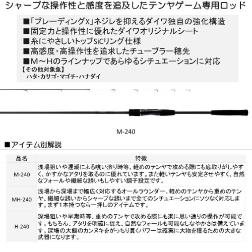 攻めのひとつテンヤ専用ロッドです。ハリのあるブランクスにより、様々な状況下でも安定してテンヤを自在に操ることができるテーパーデザインを追求。軽快な操作性能はもとより、確実なフッキングとマダイの引きをきっちりコントロールできるパワーを持ちます。