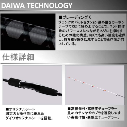 軽量・高感度のエアガイドシステム『AGS』を搭載した高級モデルです。軽量かつ剛性に優れ感度を向上させるDAIWA独自のカーボンフレームガイド「AGS」を穂先部に採用することによって感度と操作性を向上。感度と操作性を徹底的に追求したテンヤゲーム専用ロッド。X45、V-JOINTの搭載により、ブレを抑えシャープな操作性を実現し、大鯛でもスムーズで安心感のあるやり取りを可能になりました。中級者以上・向上心の高い方におすすめ。