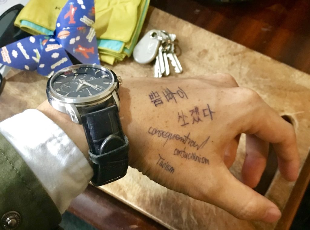 そして約束の時間になり、図書館に到着した左手の甲に「割り勘」と韓国語でクソデカく書かれた とんでもなくアホの男が一匹。