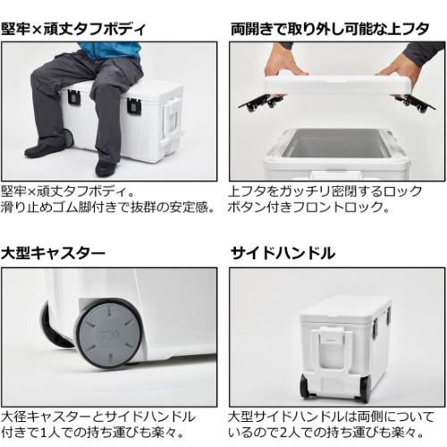 船釣りで汎用性の高い大型クーラーボックスです。サイドハンドル、ロングハンドル、キャリーが完備されており、大漁の日でも負担なく持ち運ぶことが可能。堤防釣りでは大きすぎますが、船釣り初心者では使いやすいサイズ感になっており、中型青物・ヒラメ・イサキ釣りなど幅広い釣りモノで使用されている人気モデルです。