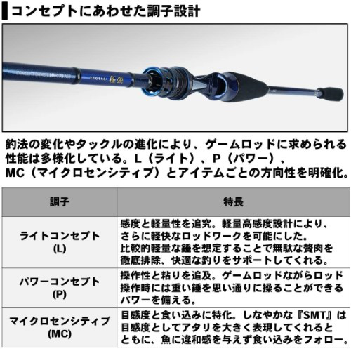 ダイワの高級汎用ライトロッドが極鋭のコンセプトゲームです。ライプとしてはL(ライト)、P(パワー)、MC(マイクロセンシティブ)、F(極先調子)があり、方向性を明確化。湾フグには目感度と食い込みに特化したMCモデルが最適でしょう。