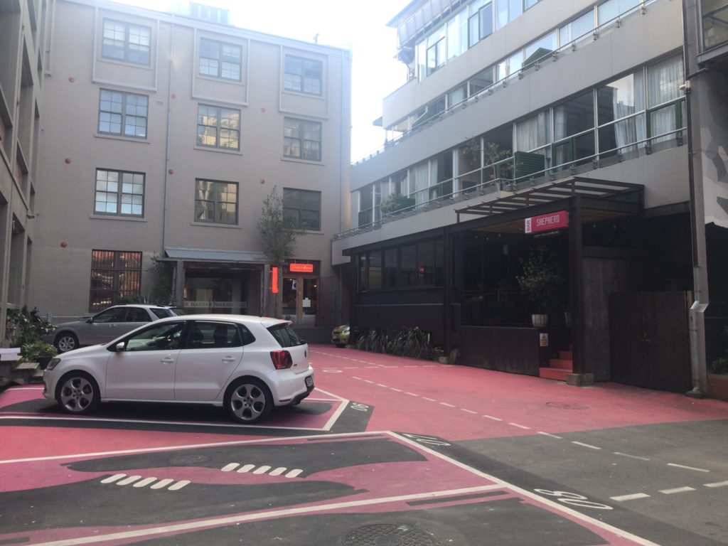 ☝路地裏を進んでいくと、こんな感じの赤く塗装された駐車場に出ます。